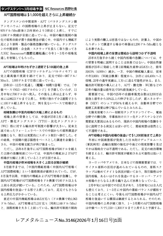 アルム出版社 レアメタルニュース タングステン 26年1-3月相場予測