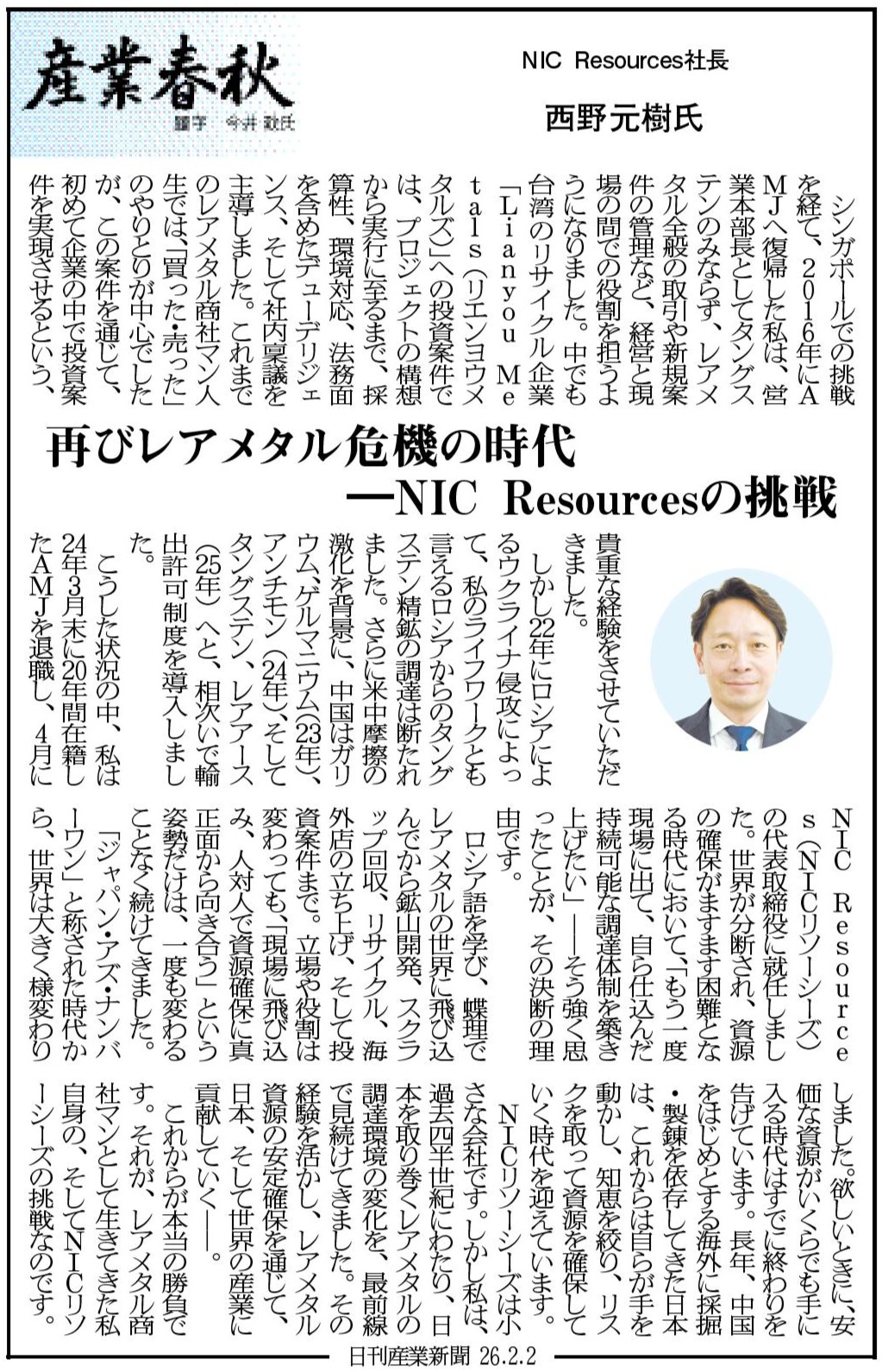 日刊産業新聞 産業春秋 再びレアメタル危機の時代 -NIC Resourcesの挑戦