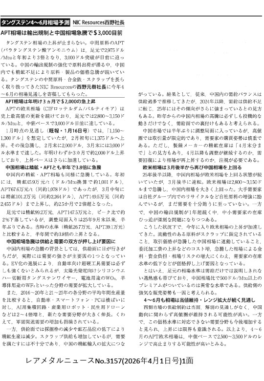 アルム出版社 レアメタルニュース タングステン 26年4-6月相場予測